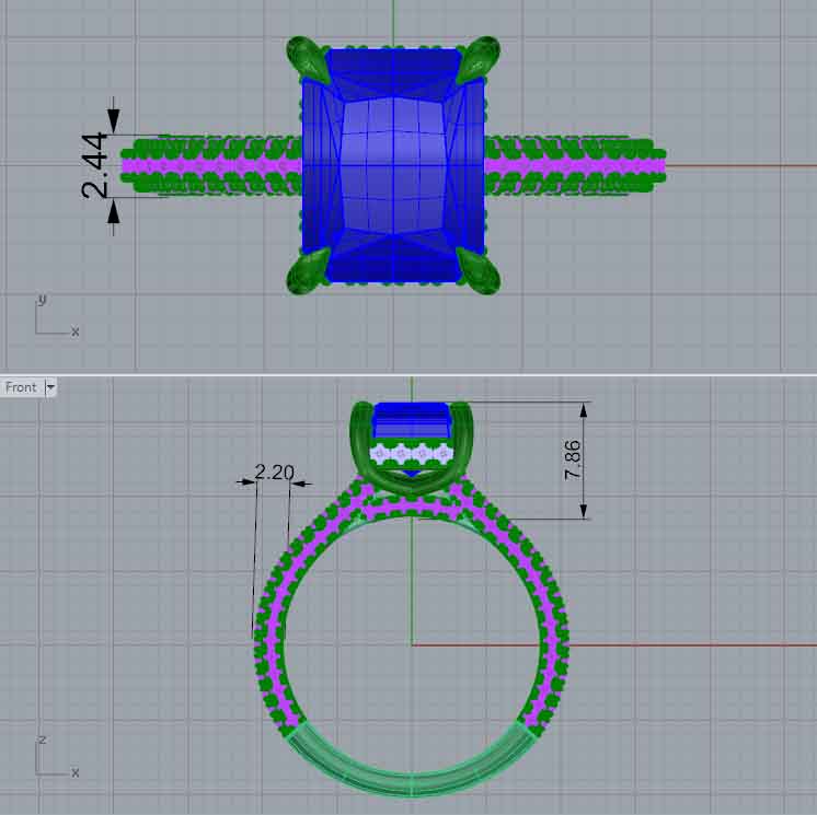 The default design option includes a center stone of approximately 9x7mm, guaranteed to be a minimum of 3+ carat lab-grown emerald cut diamond, D-colorless, VVS1 clarity, VG cut, excellent polish, and VG symmetry, complete with an IGI certificate.