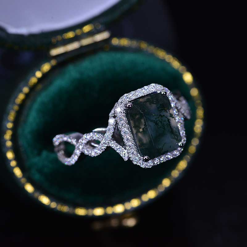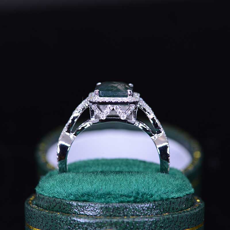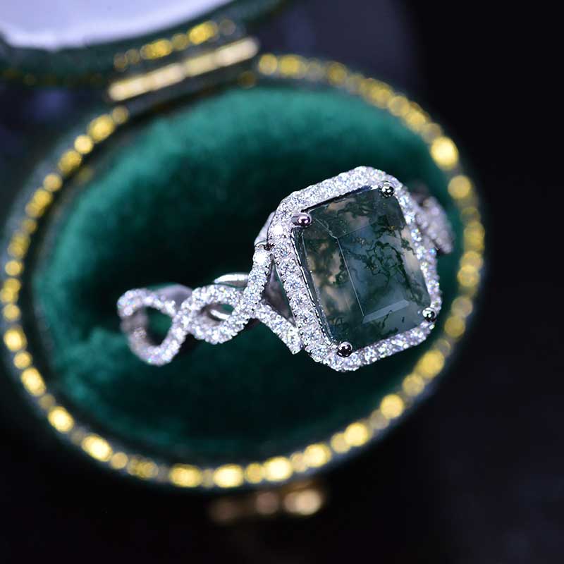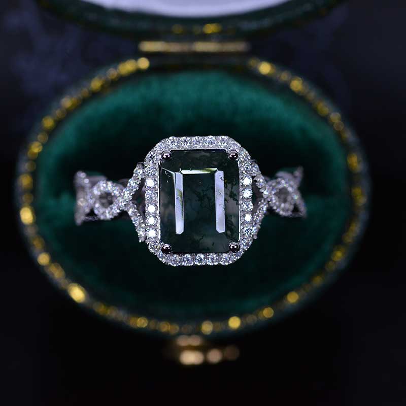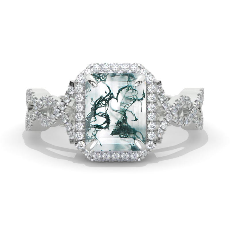 The default design option features 4 Carat 10x8mm Emerald Cut Genuine Moss Agate Center Stone set with 1.2 CTW Moissanite Accent Stone: D-Colorless, VVS1-Clarity, VG-Cut, Ex-Polish, VG-Symmetry
