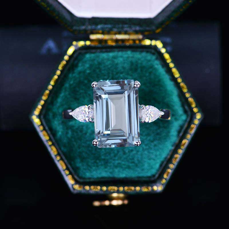 The default design option features approximately 4 Carat Genuine Natural Aquamarine - Emerald Cut 12x8mm, VG-Cut, Ex-Polish, VG-Symmetry Center Stone with