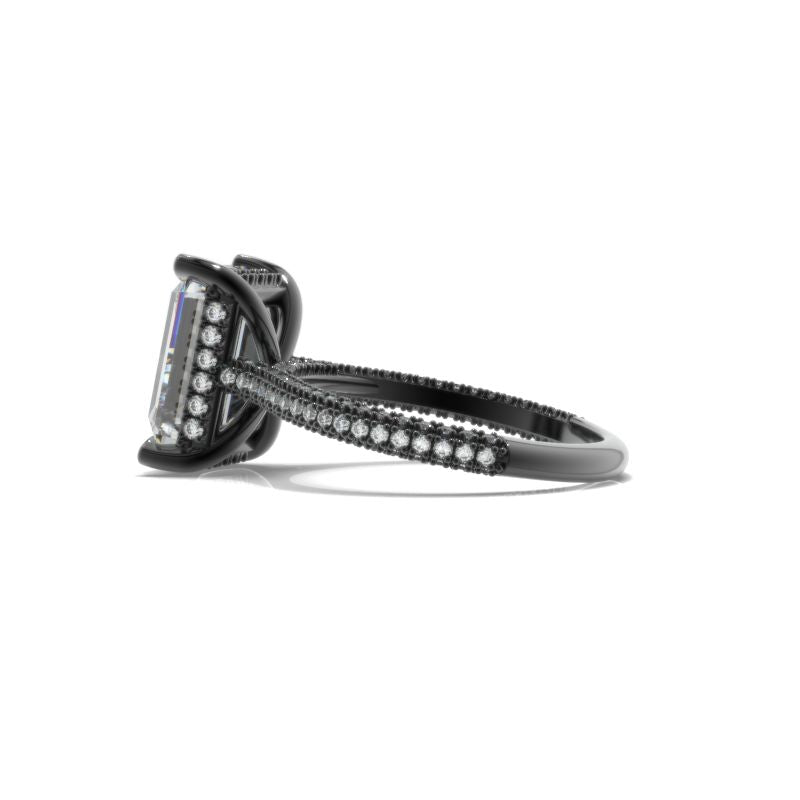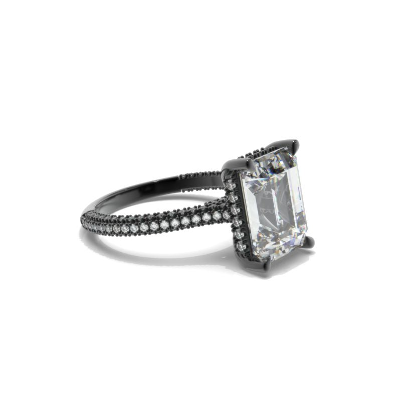 The default design option features approximately 4 Carat Giliarto Moissanite- Emerald 10x8mm D-Colorless, VVS1-Clarity, VG-Cut, Ex-Polish, VG-Symmetry Center Stone with