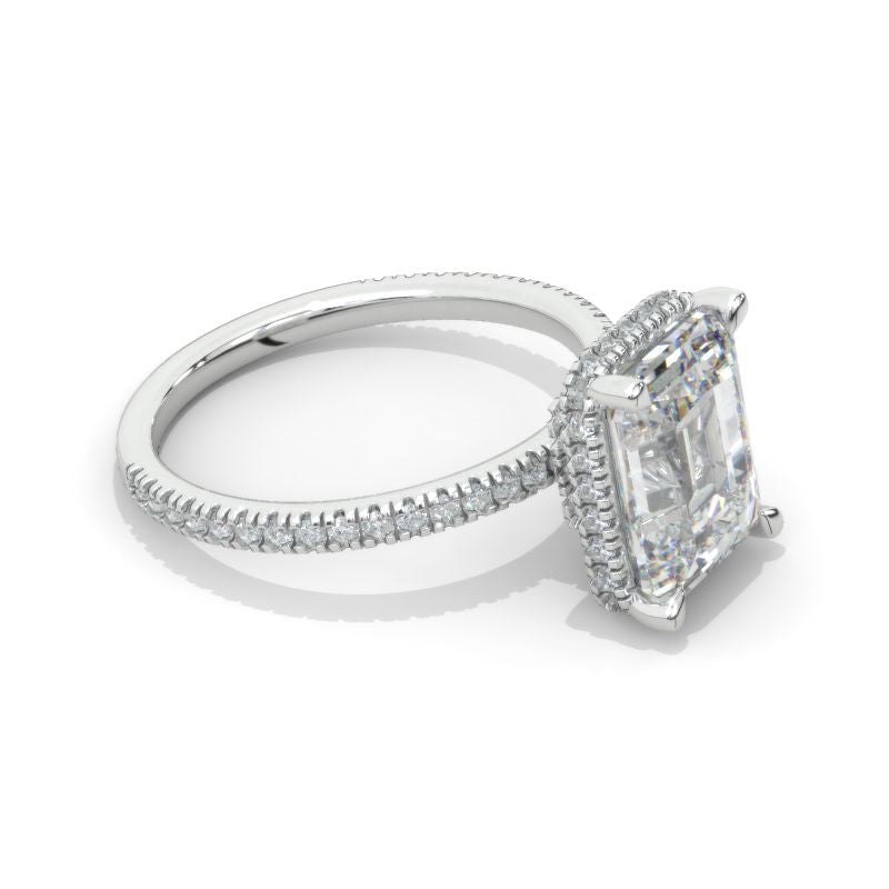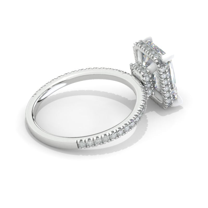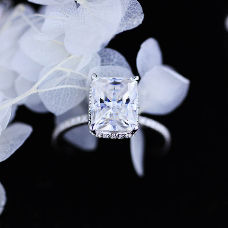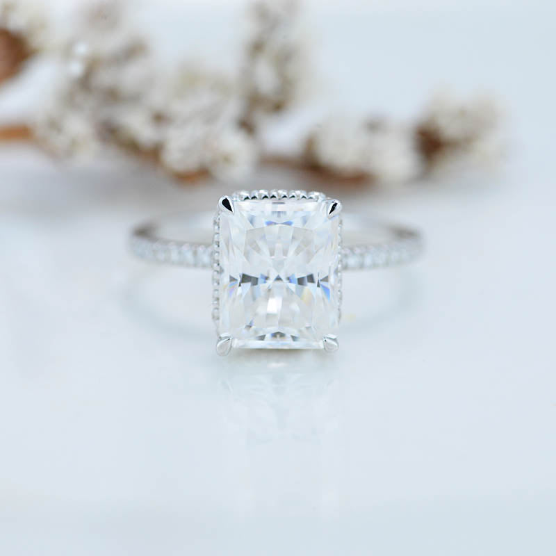 The default design option features approximately 4 Carat Giliarto Moissanite- Radiant Cut 10x8mm D-Colorless, VVS1-Clarity, VG-Cut, Ex-Polish, VG-Symmetry Center Stone with