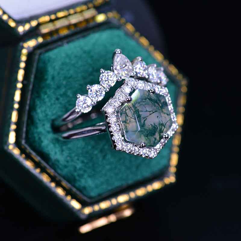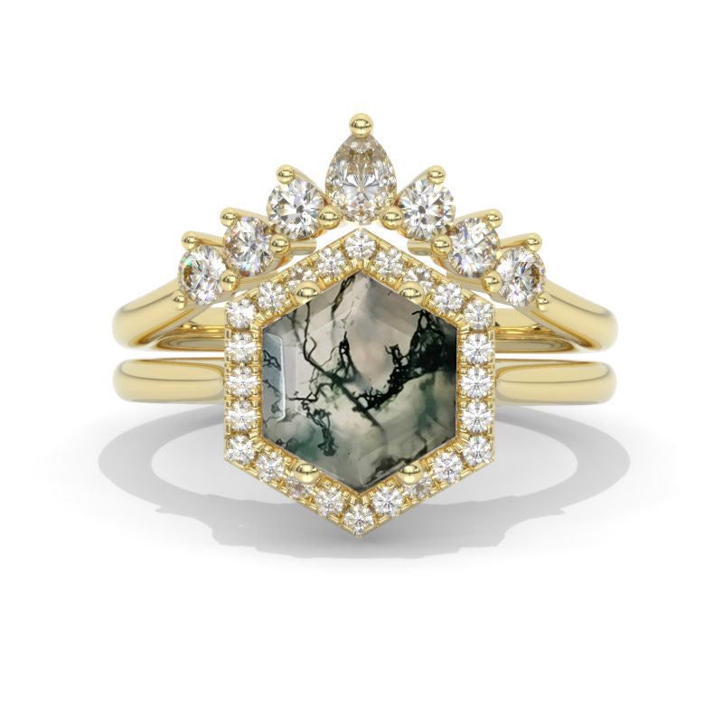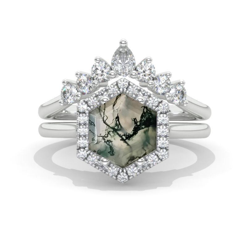 4 Carat Hexagon Genuine Moss Agate Halo 14K White Gold Engagement Ring, Eternity Ring Set Model 794-9x8