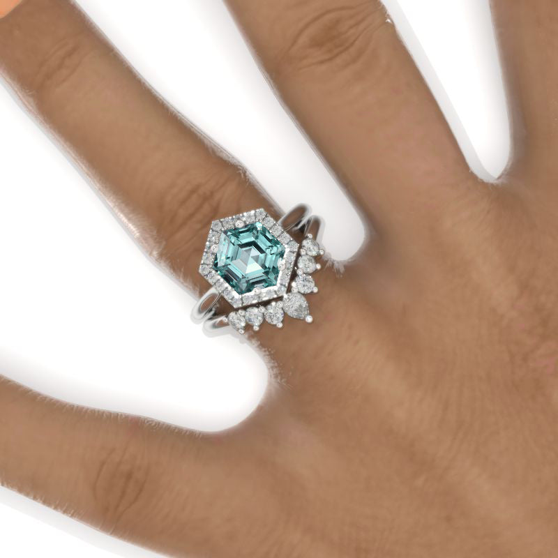 4 Carat Hexagon Mint Sapphire Halo 14K White Gold Engagement Ring, Eternity Ring Set
