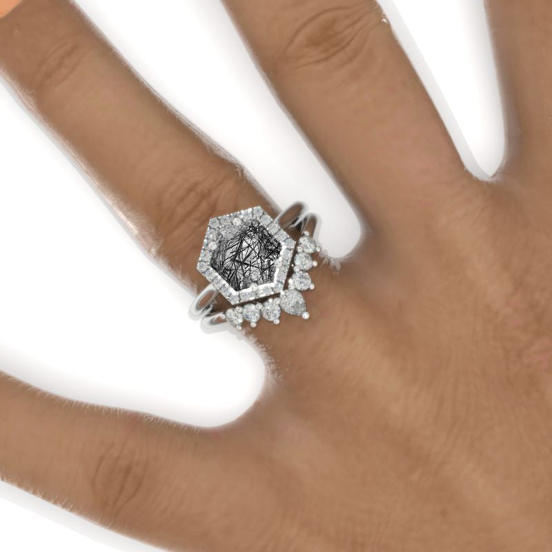 4 Carat Hexagon Rutilated Quartz Halo 14K White Gold Engagement Ring, Eternity Ring Set