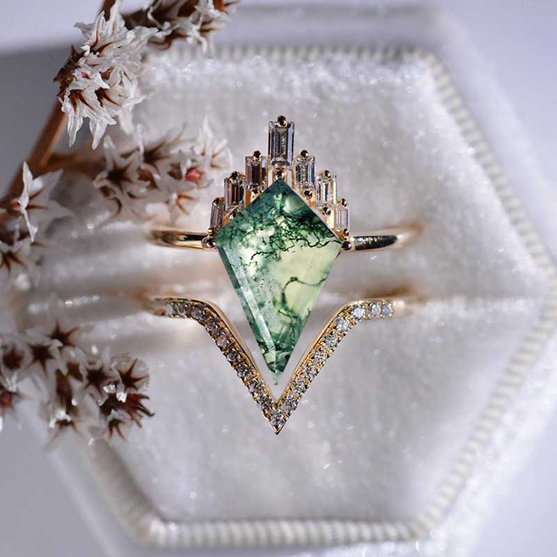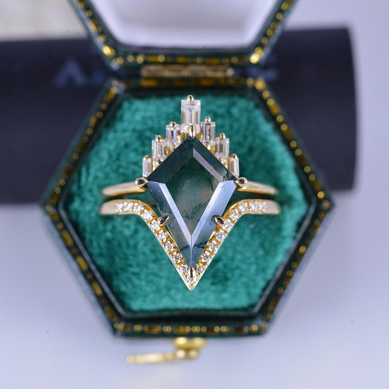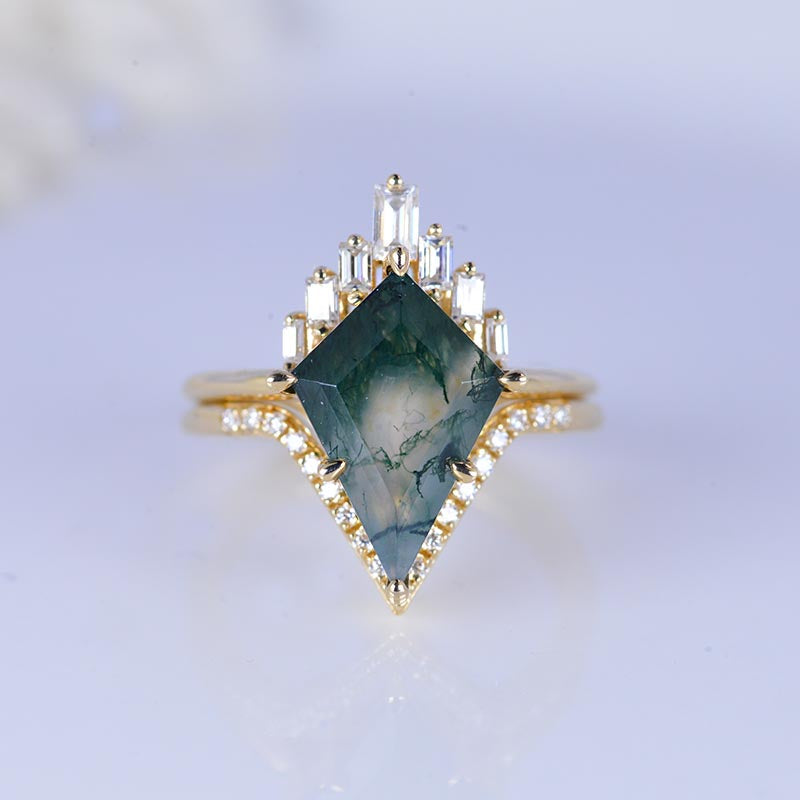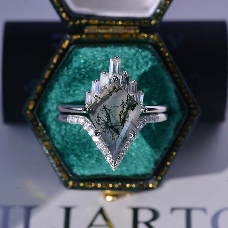 4 Carat Kite Genuine Moss Agate Halo Engagement Ring, Eternity Ring Set