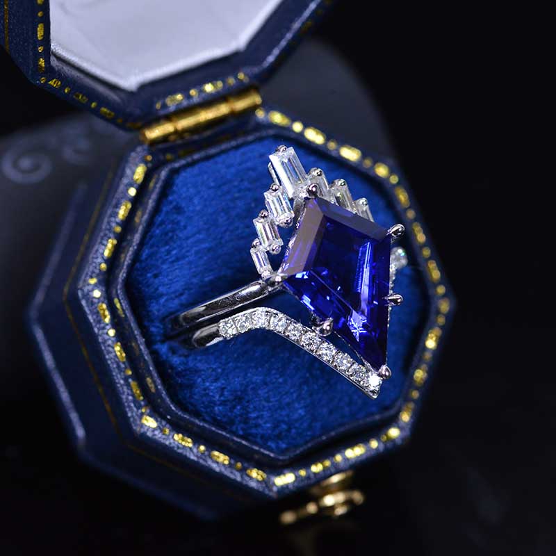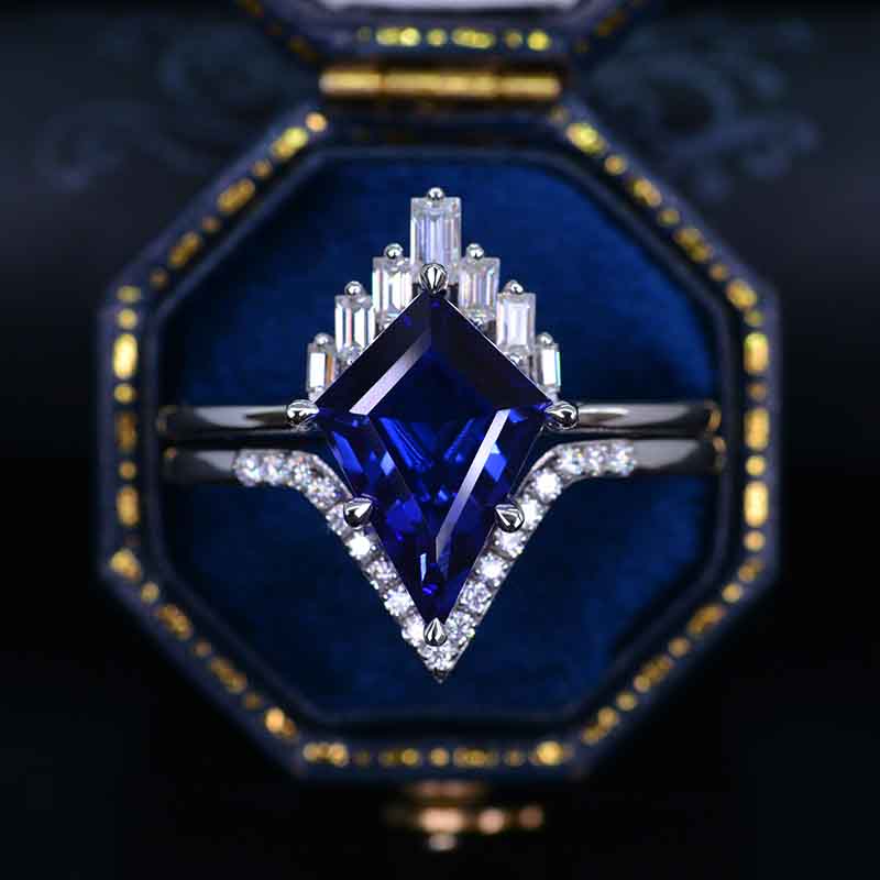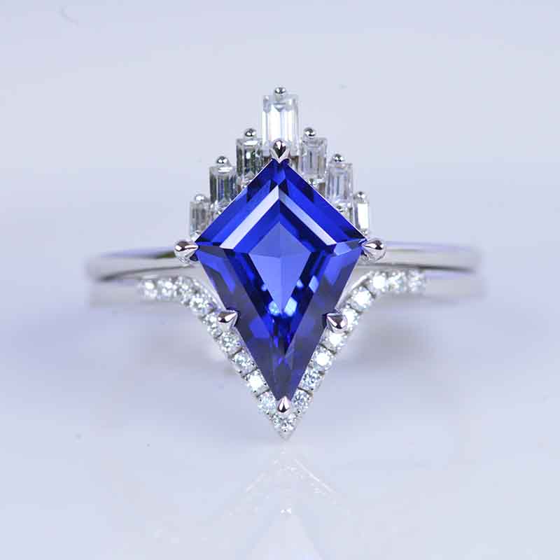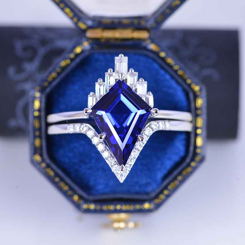 Engagement : Top Quality  4 Carat Ethically LAB-Grown Royal Blue Sapphire Kite 14x10 mm VVS1-Clarity, VG-Cut, Ex-Polish, VG-Symmetry Center Stone with 38 Moissanite  D-Colorless, VVS1-Clarity, VG-Cut,0.5 CTW  Accent Stones 14K White Gold  Ring.