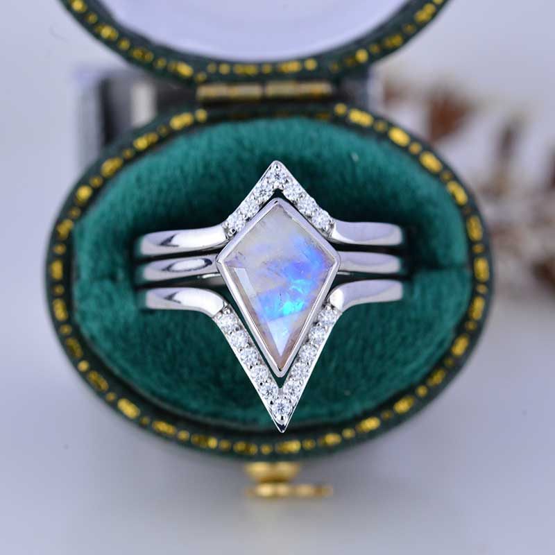 4 Carat Kite Vintage Kite Cut Genuine Moonstone Halo Engagement Ring, Three Rings Set 14K White Gold