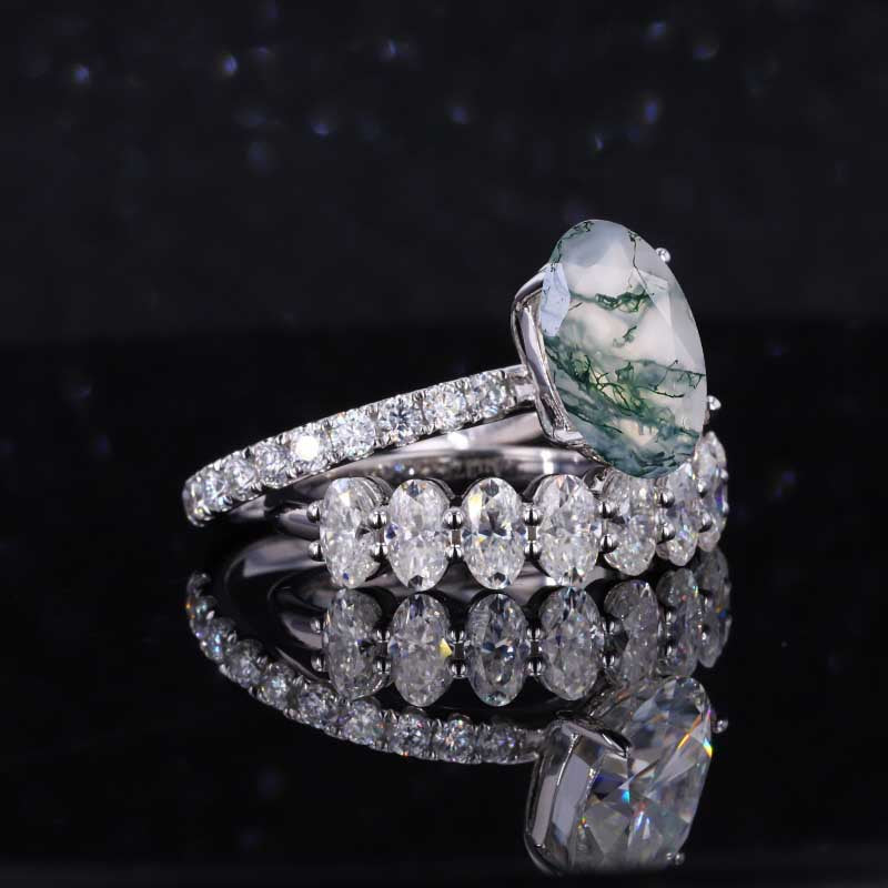 4 Carat Oval Cut Genuine Moss Agate White Gold Engagement Ring Set - Giliarto