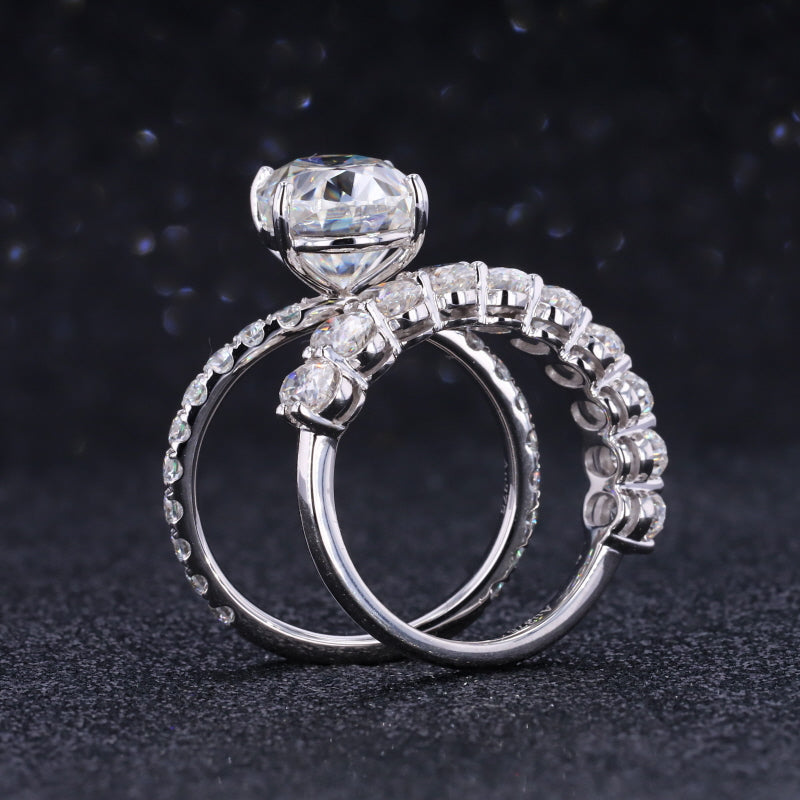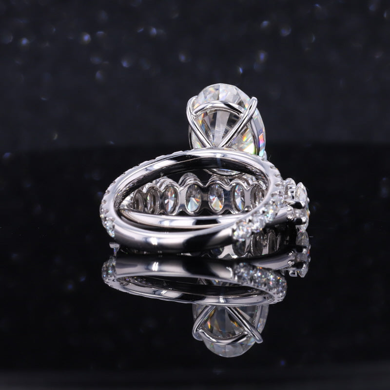 The default design option features 4 Carat Elongated Oval Cut 12x8.5mm Giliarto Moissanite Center Stone D-Colorless, VSS1-Clarity, VG-Cut, Ex-Polish, VG-Symmetry, Set With 42 - Accent Stones 0.37 CTW