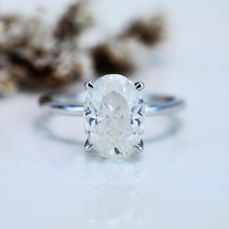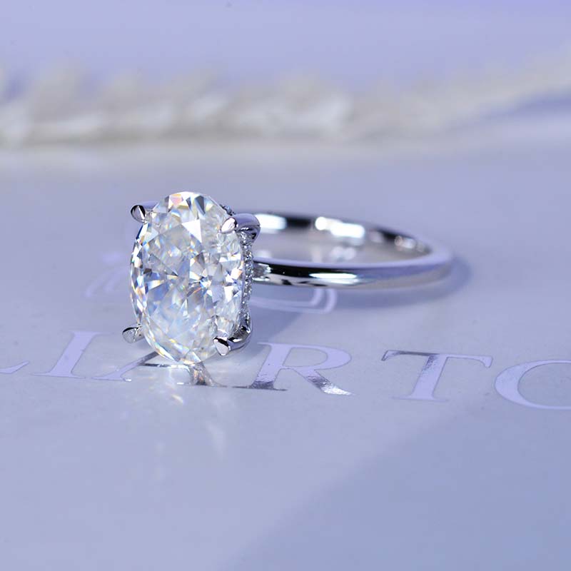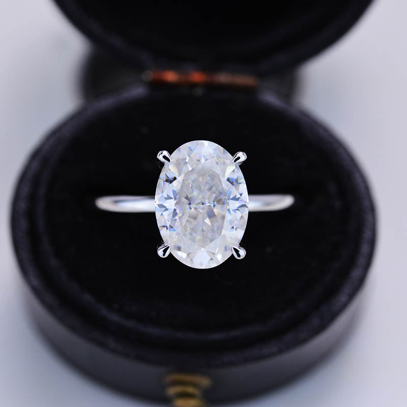 4 Carat Oval Cut 12x8mm Center Stone, Ex-Cut, Ex-Polish, VG-Symmetry with 0.1 CTW Colorless Moissanite Accents 14K White Gold. Gem Type : Moissanite Carat : 4 CT Color : D - Colorless Shape : Oval Ice Crushed Cut Clarity : VVS1 Luster : Excellent Main Stone MM : 12x8 MM Accent Stones : 0.1 CTW D- Colorless Moissanite -26 pieces Model 597-12x8mm