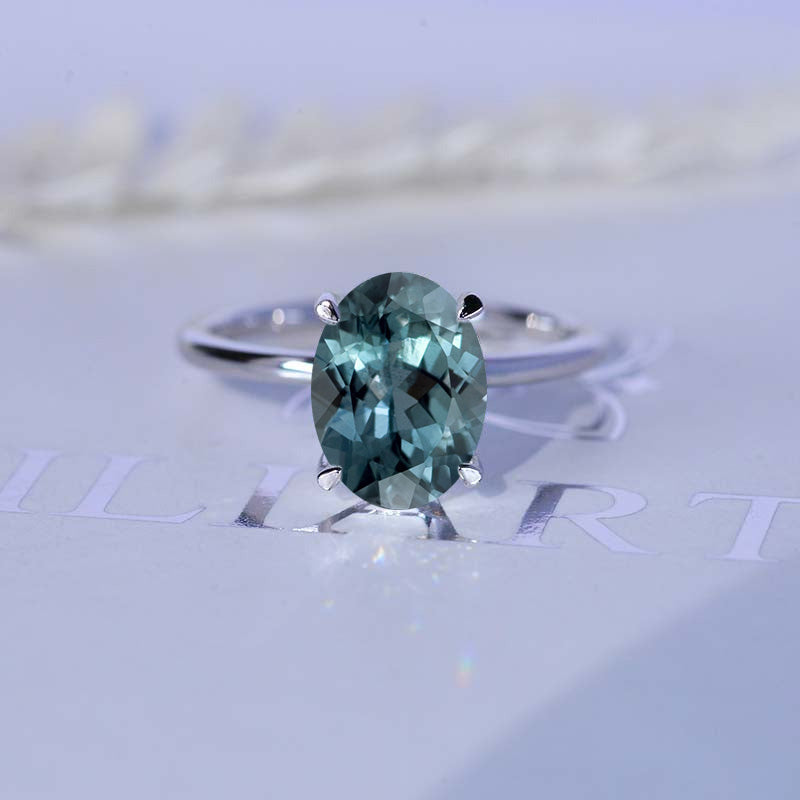 4 Carat Oval Cut Teal Sapphire Ring, Hidden Halo Gold Engagement Ring Classics