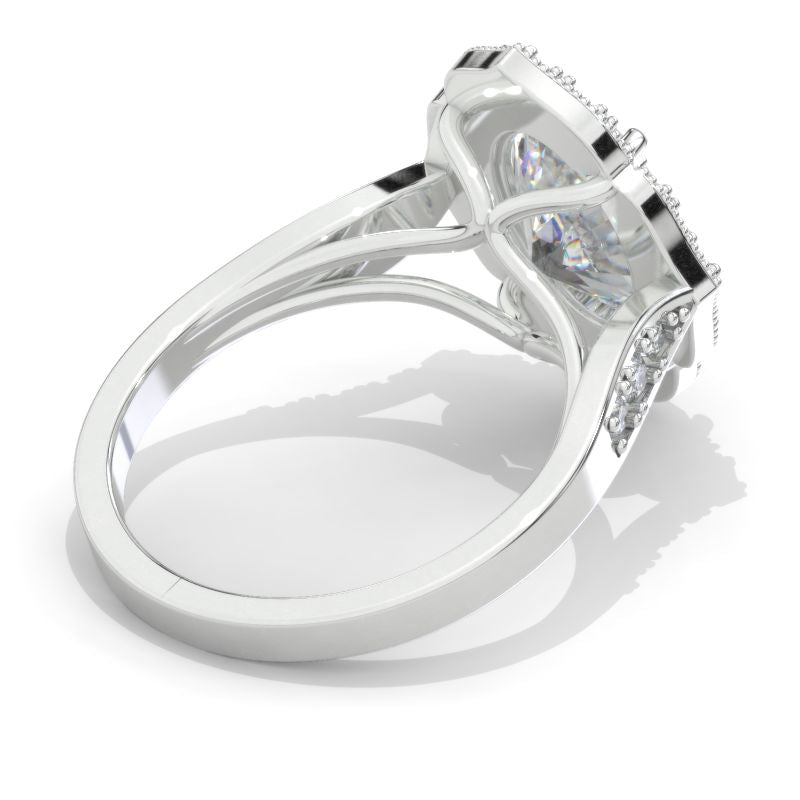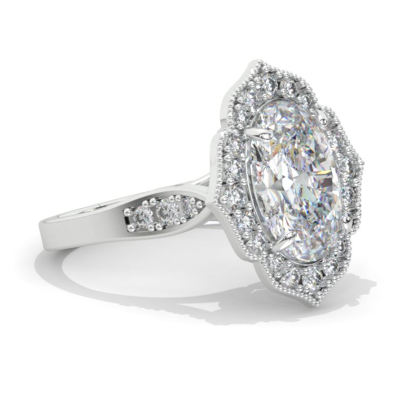 The default design option features 12x8mm Oval Cut LAB-Grown Diamond and Accent Stones, D-Colorless, VVS1-Clarity, VG-Cut, Ex-Polish, VG-Symmetry, Set with Colorless LAB-Grown Diamond Accent stones in 14K White Gold Engagement Ring.