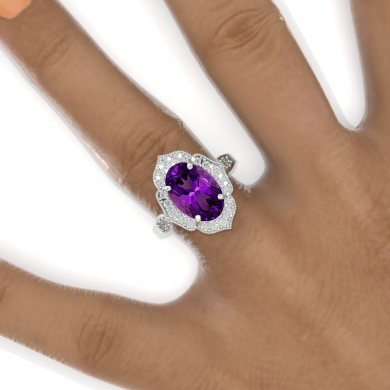 4 Carat Oval Natural Amethyst Halo Engagement Ring, Promise Ring For H - Giliarto