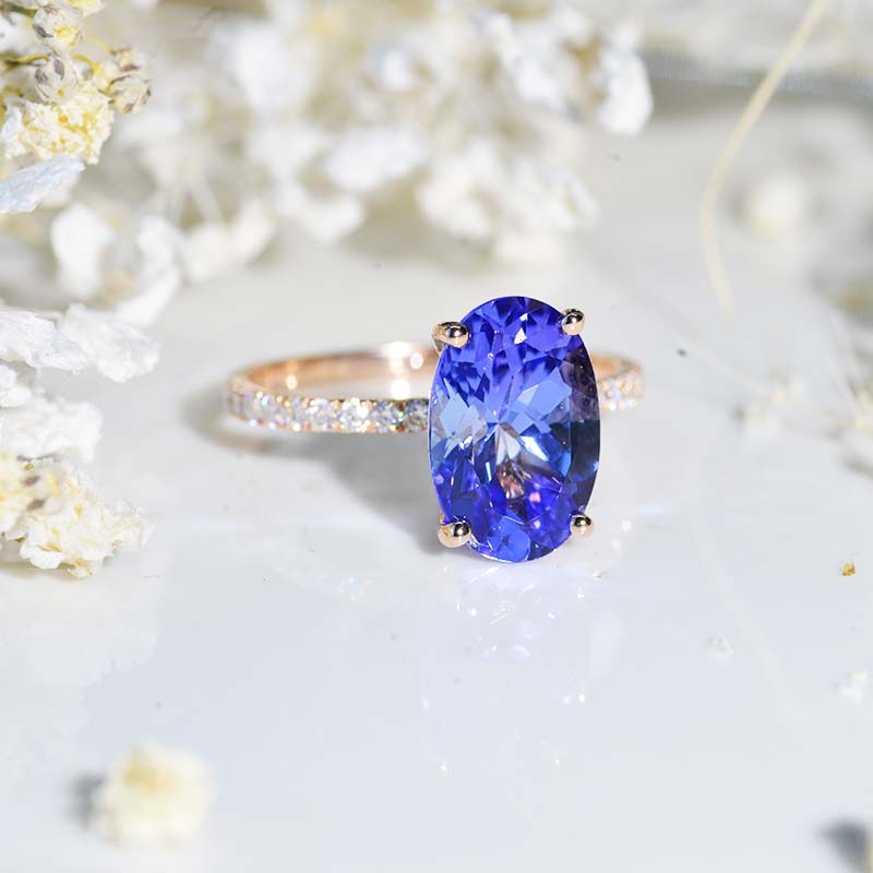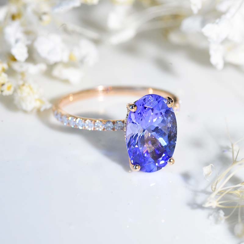 The default design option features approximately 12x8mm Oval Cut Natural Genuine Tanzanite and Accent Stones, D-Colorless, VVS1-Clarity, VG-Cut, Ex-Polish, VG-Symmetry, in 14K White Gold Engagement Ring.