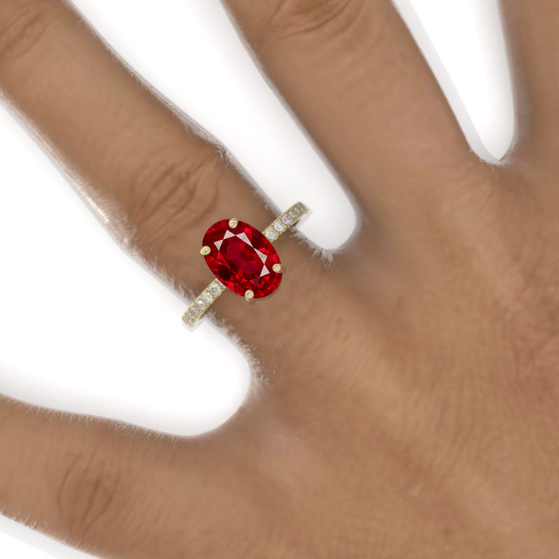 The default design option features 12x8mm Oval Cut Ethically Lab-Grown Ruby AAA+ Grade and Accent Stones, VG-Cut, Ex-Polish, VG-Symmetry, Set with Colorless Moissanite Accent stones in 14K White Gold Engagement Ring.