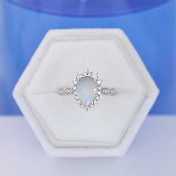 4 Carat Pear Cut Genuine White Opal Halo 14K White Gold Engagement Rin - Giliarto