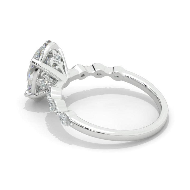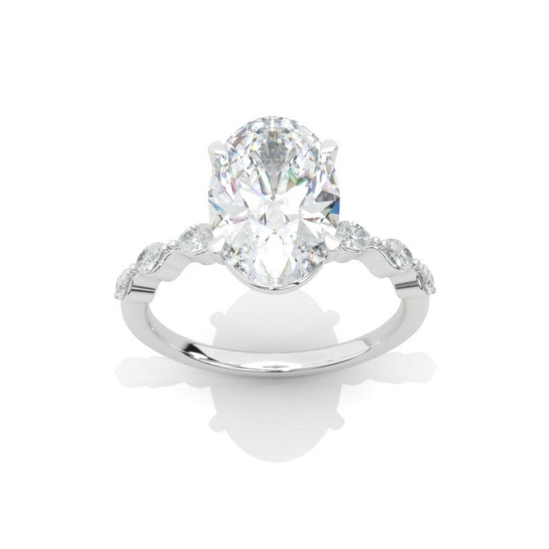 The default design option features 12x8 mm Approximately 4.5+ Ct OvalLAB-Grown Diamond Stones D-Colorless, VVS1-Clarity, VG-Cut, Ex-Polish, VG-Symmetry set with D- Colorless LAB-Grown Diamond Accent Stones