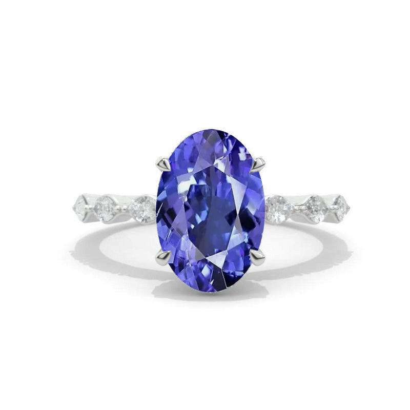 The default design option features 12x8 mm 4.5 Ct Oval Natural Genuine Tanzanite Stones VG-Cut, Ex-Polish, VG-Symmetry set with D- Colorless Moissanite Accent Stones