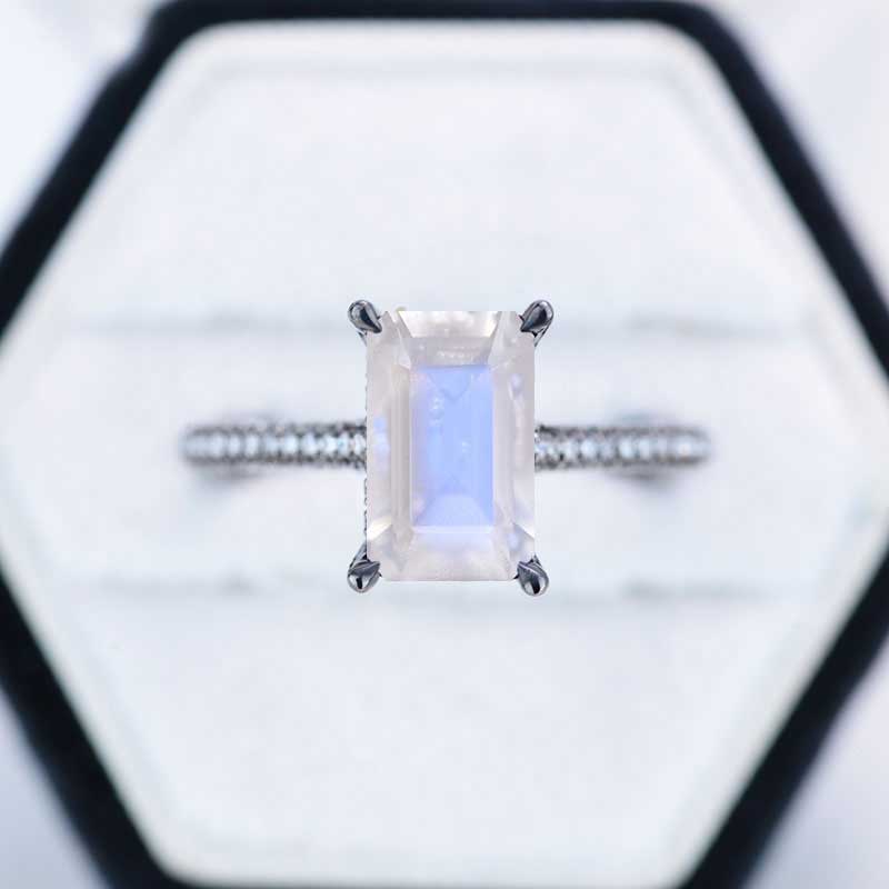 Solitaire Micro Pave Accents Stones, Hidden Halo Emerald Cut Genuine Moonstone Engagement ring. Rhodium Plated