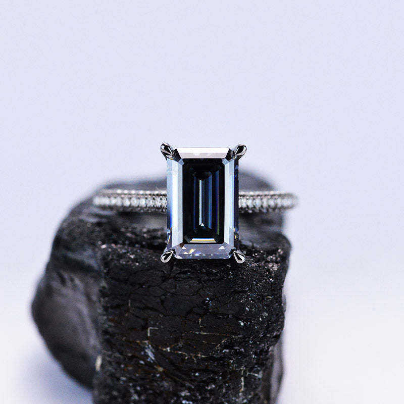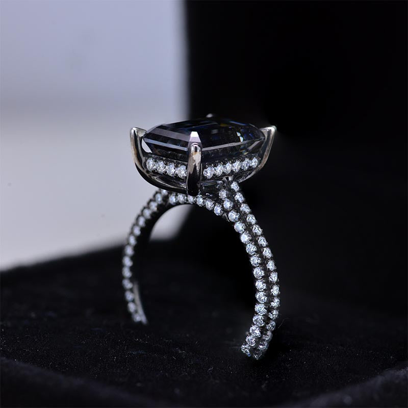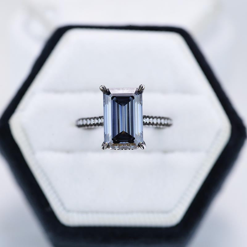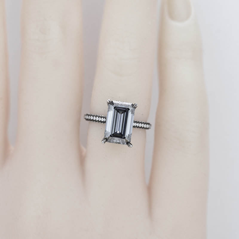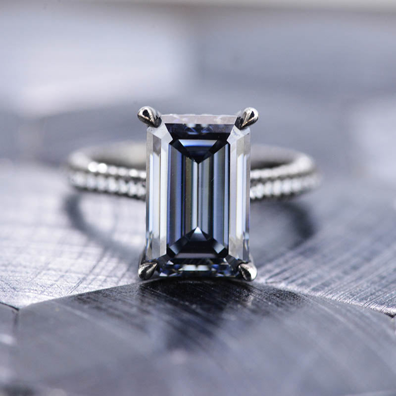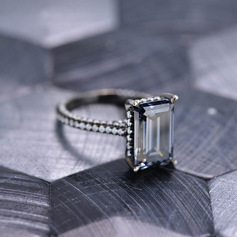 Setting:14K Black Gold Center Stone:11x7mm Emerald Cut Gray Spinel 4 Carat. Color: Gray Clarity: VVS1, Side Stones: Moissanite, D-Colorless Clarity: VS2-Si1, Cut: Excellent The total approximate weight of side stones: 130- 1.5 CTW Shank width: 2 mm Matching Band:
