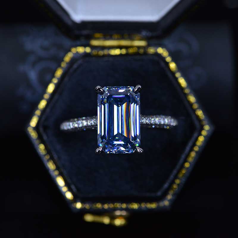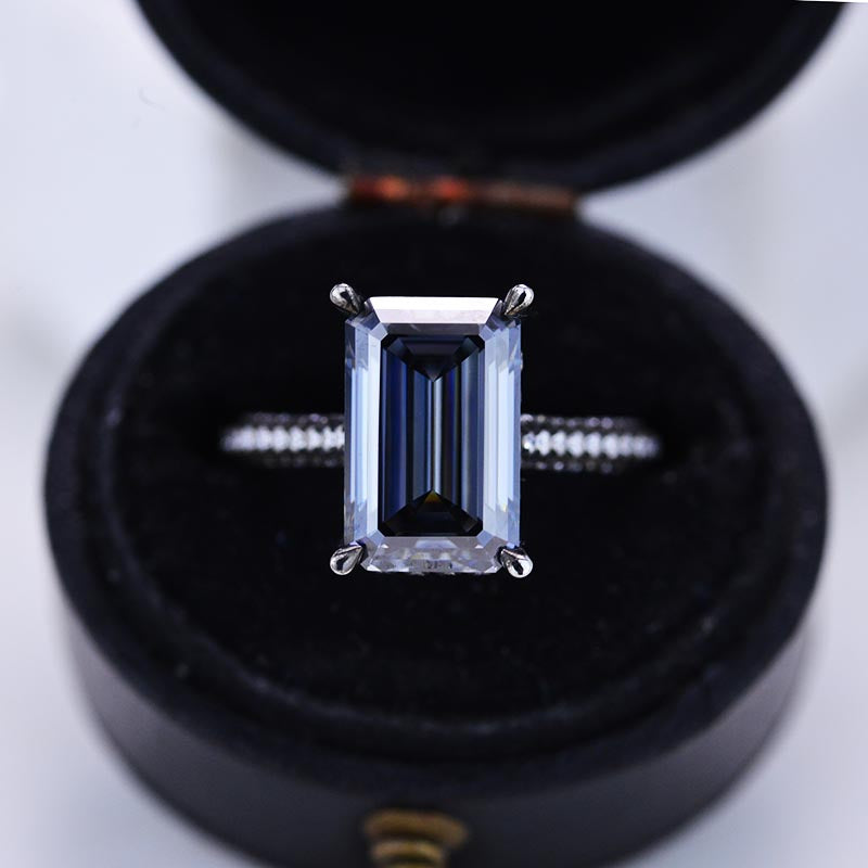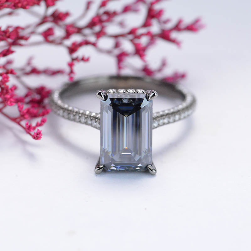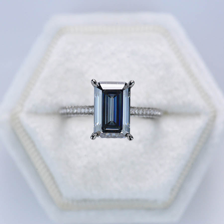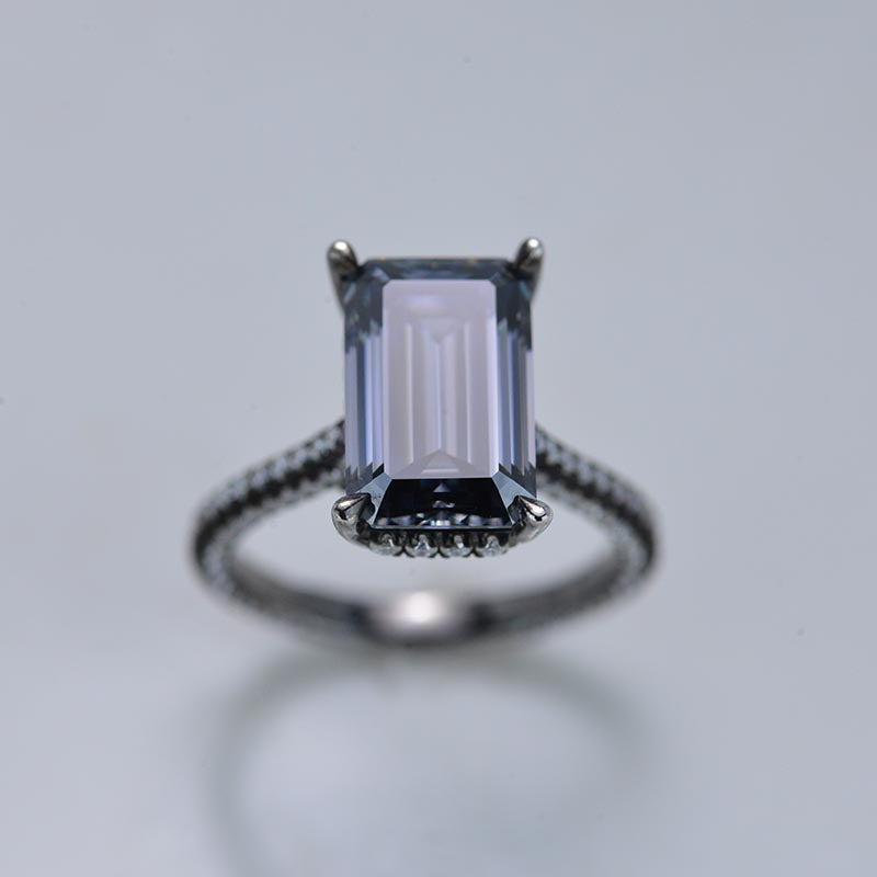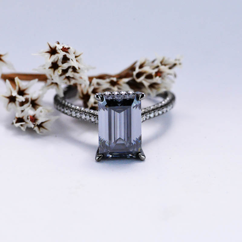 Setting:14K Black Gold Center Stone:11x7mm Emerald Cut Gray Spinel 4 Carat. Color: Gray Clarity: VVS1, Side Stones: Moissanite, D-Colorless Clarity: VS2-Si1, Cut: Excellent The total approximate weight of side stones: 130- 1.5 CTW Shank width: 2 mm Matching Band: