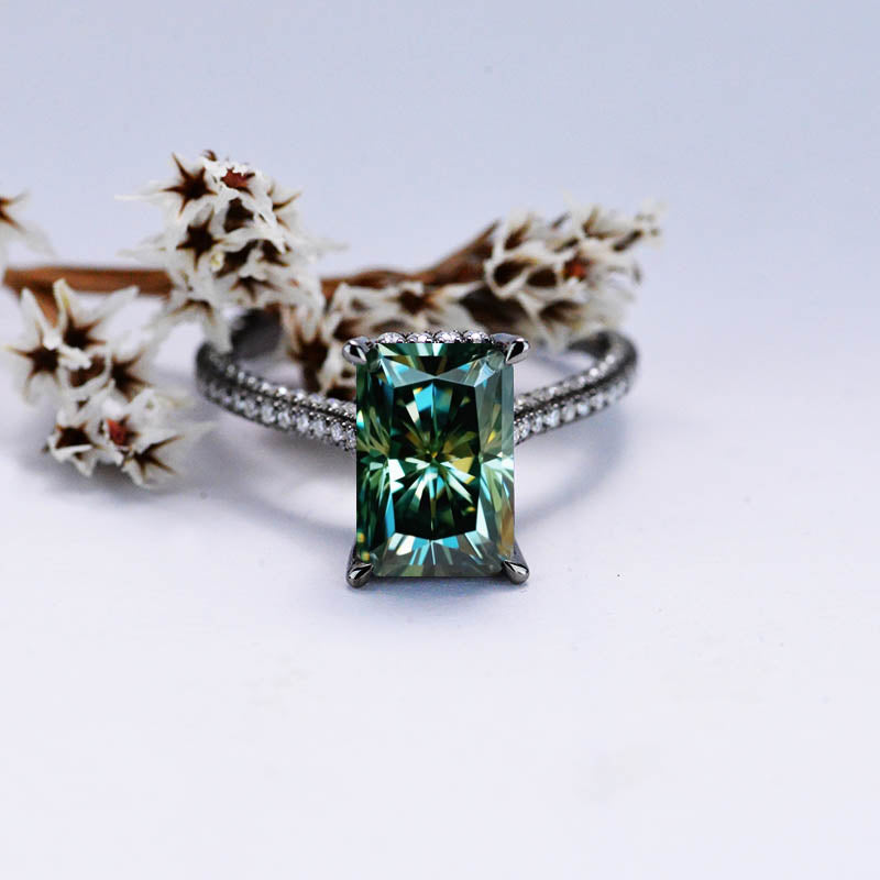 Center Stone:11x7mm Emerald Cut Green Moissanite 4 Carat. Clarity: VVS1, Side Stones: Moissanite, D-Colorless Clarity: VS2-Si1, Cut: Excellent