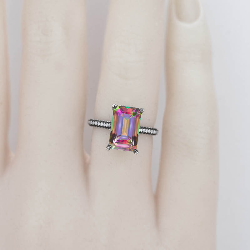 Center Stone:11x7mm Emerald Cut Genuine Naturae Mystic Topaz 4 Carat. Clarity: VVS1, Side Stones: Moissanite, D-Colorless Clarity: VS2-Si1, Cut: Excellent