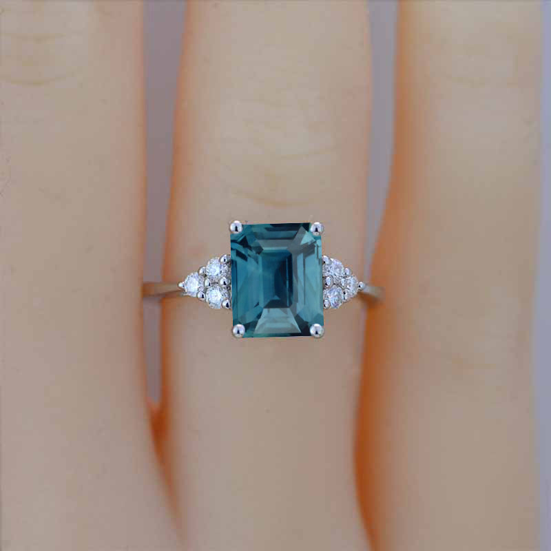 The default design option features 10x8mm Emerald Cut Ethically Lab-Grown Teal Sapphire, VG-Cut, Ex-Polish, VG-Symmetry set With D-Colorless Moissanite
