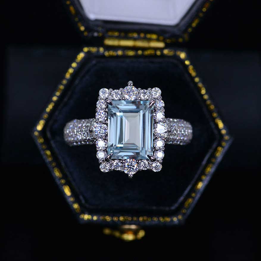 4Ct Genuine Natural Aquamarine Engagement Ring Halo Emerald Cut Genuine Natural Aquamarine Engagement Ring
