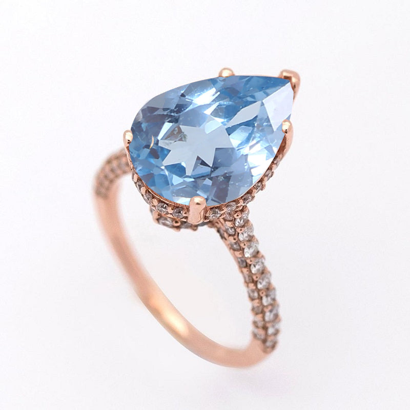 The default design option features 12x8mm Pear Genuine Natural Aquamarine, Set with Moissanite Accent Stones, D-Colorless, VVS1-Clarity, VG-Cut, Ex-Polish, VG-Symmetry