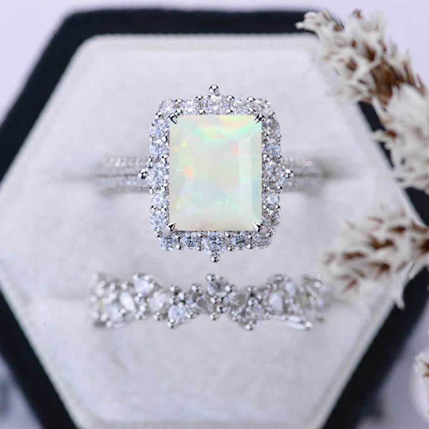 4Ct Genuine White Opal Engagement Ring Halo Emerald Cut Genuine White - Giliarto