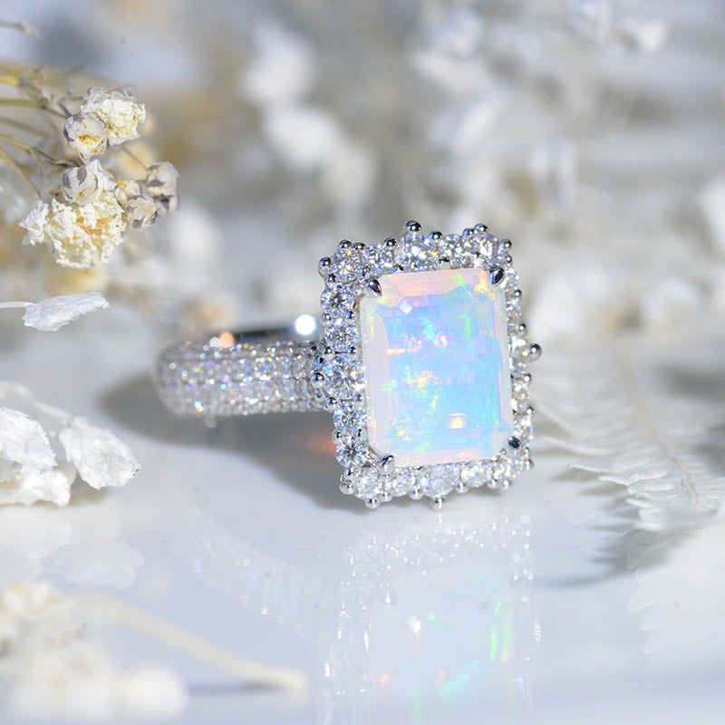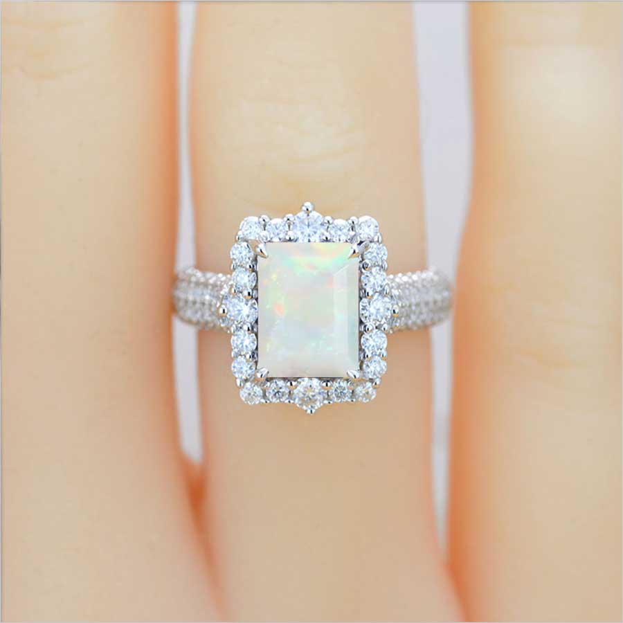 4Ct Genuine White Opal Engagement Ring Halo Emerald Step Cut Genuine White Opal Engagement Ring