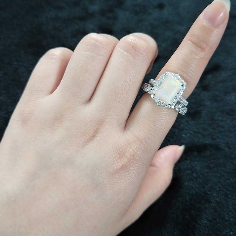 4Ct Genuine White Opal Engagement Ring Halo Radiant Cut Genuine White Opal Engagement Ring, 10x8mm Radiant Cut Genuine White Opal Engagement Ring with Eternity band