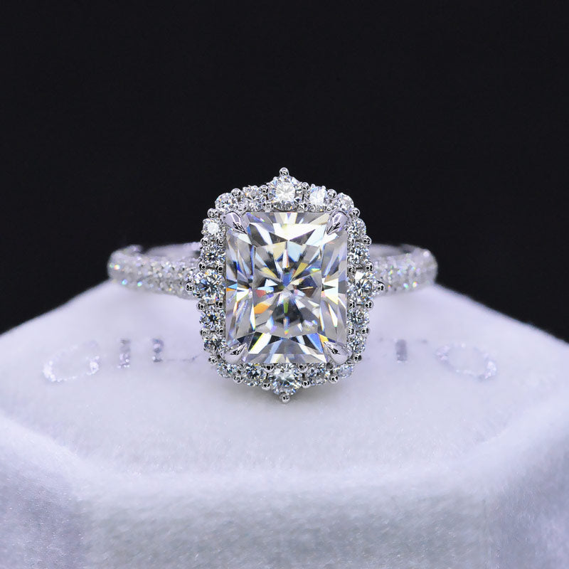 3 Carat Radiant Cut Center Stone Engagement ring. (Engagement Ring Only!) Setting: 14K White Gold (Available in Yellow Gold and Rose Gold) Center Stone: 3 Carat - 9x7 mm Radiant Cut Moissanite Color: D-Colorless Clarity: VVS1 Side Stones: Moissanite Color: D-Colorless Clarity: VVS1 Cut: Excellent The total approximate weight of side stones: 0.9ct - 198 pieces.