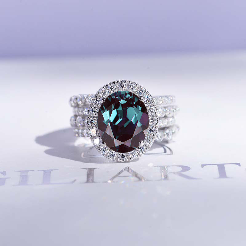 The default design option features 4 Carat - 11x9mm Oval Cut Ethically Lab-Grown Alexandrite stones, VG-Cut, Ex-Polish, VG-Symmetry Set with 1.5TCW D- Moissanite Accents