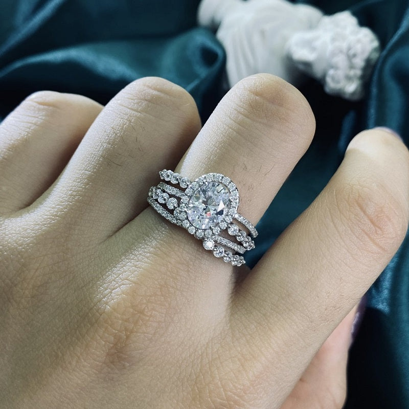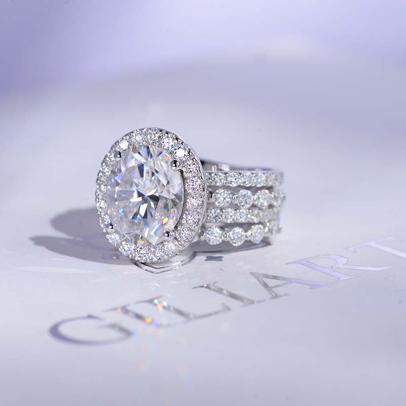 The default design option features 4 Carat - 11x9mm Oval Cut Moissanite stonesD-Colorless, VVS1-Clarity, VG-Cut, Ex-Polish, VG-Symmetry Set with 1.5TCW D- Moissanite Accents