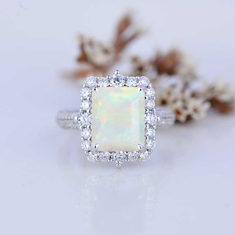 4 Carat Natural Genuine White Opal Emerald Shaped Step Cut Center Stone Engagement ring.
