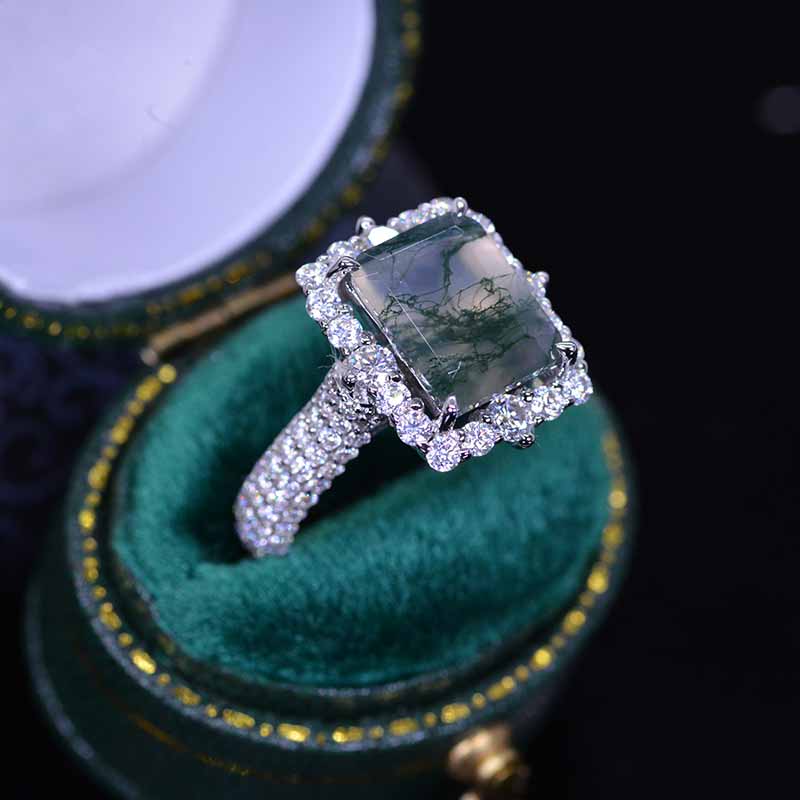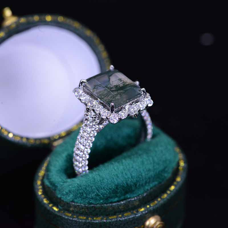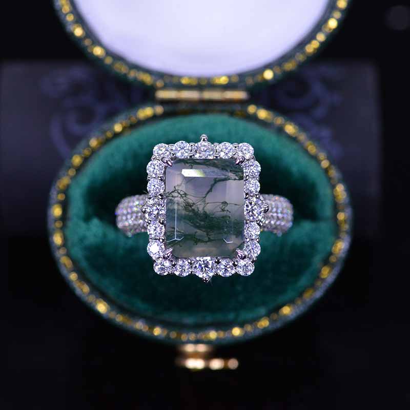 The default design option features 10x8mm Emerald Cut Genuine Moss Agate Center Stone, Moissanite AccentsD-Colorless, VVS1-Clarity, VG-Cut, Ex-Polish, VG-Symmetry