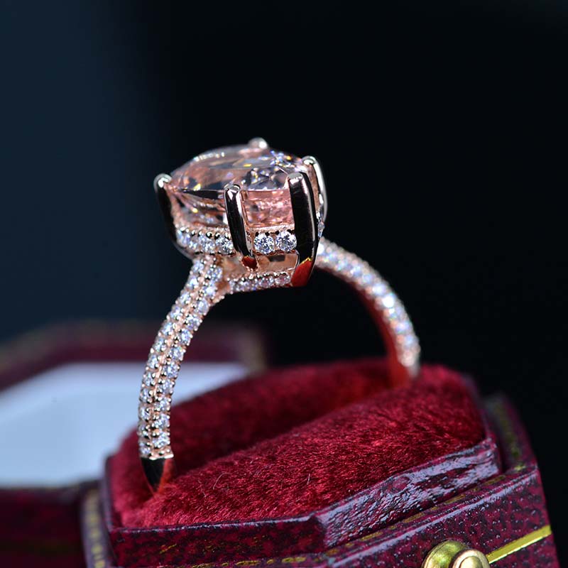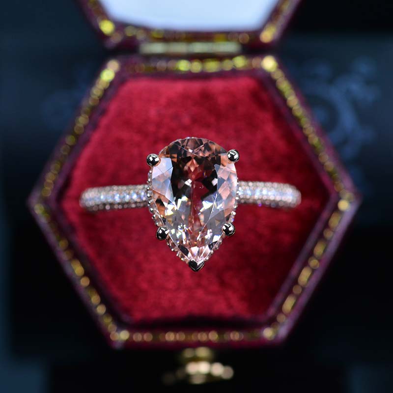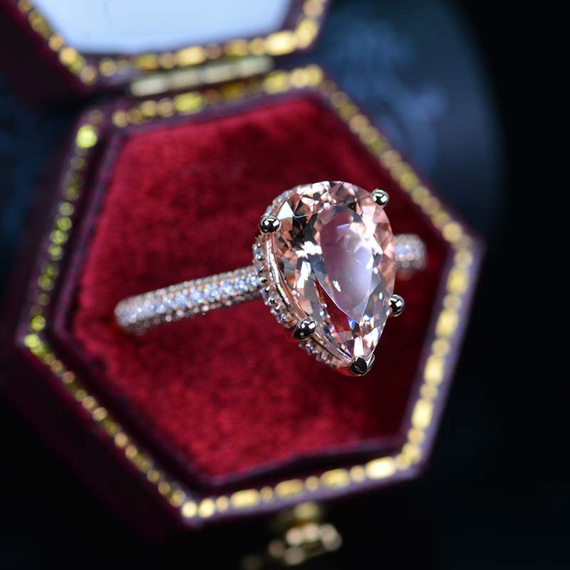 The default design option features 12x8mm Pear Natural Peach Morganite, Set with Moissanite Accent Stones, D-Colorless, VVS1-Clarity, VG-Cut, Ex-Polish, VG-Symmetry