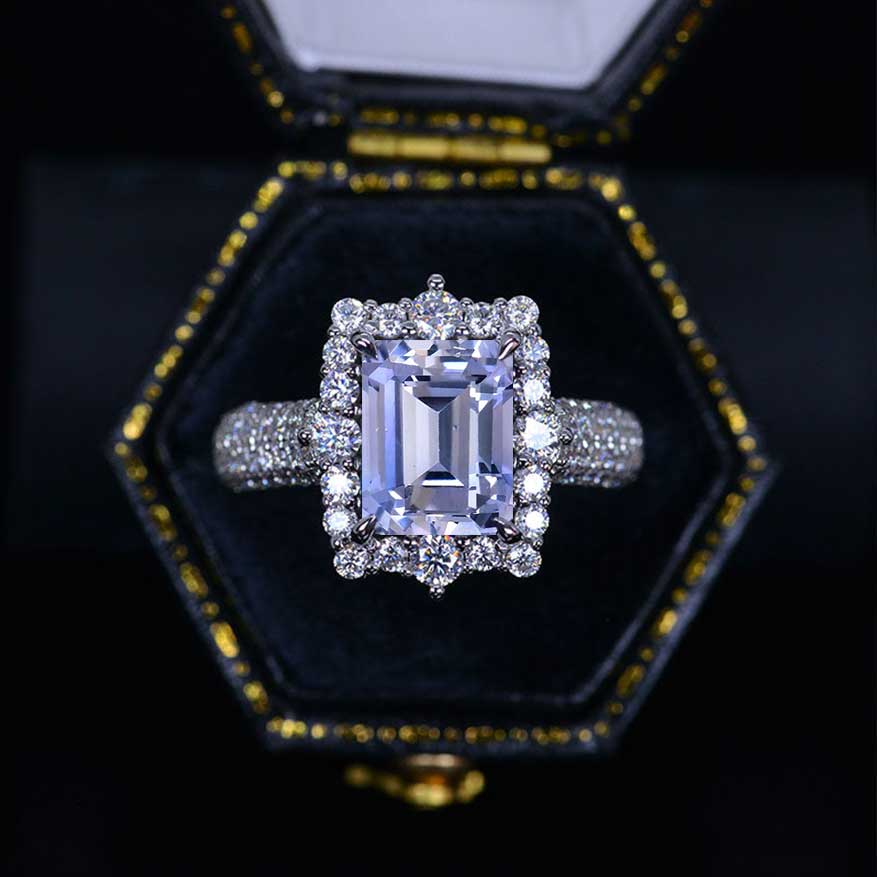 4 Carat Emerald Cut Ethically Lab-Grown Purple Sapphire Center Stone Engagement ring.