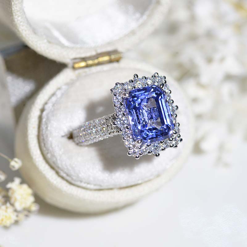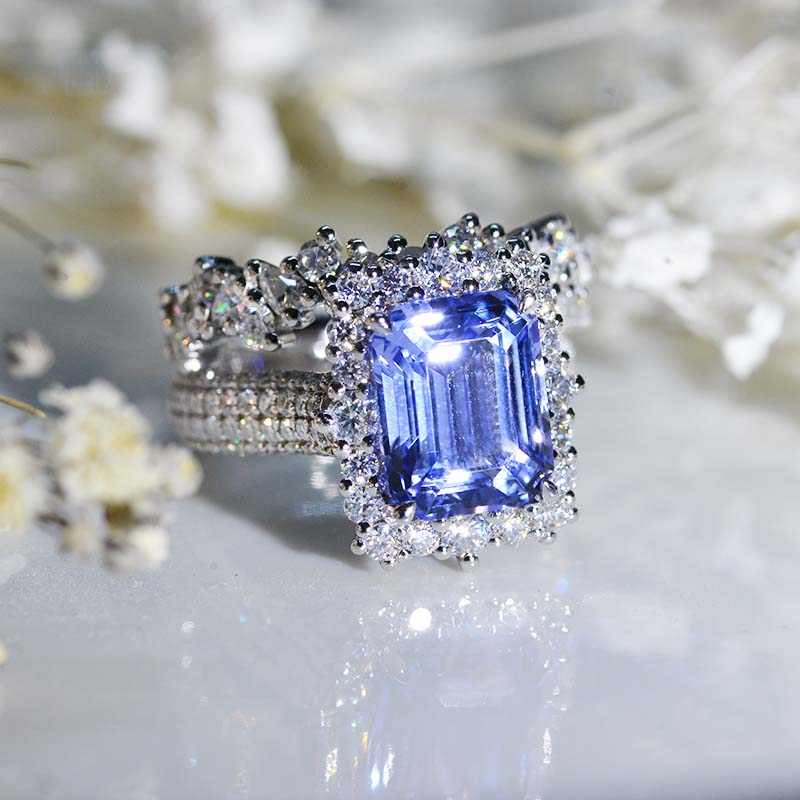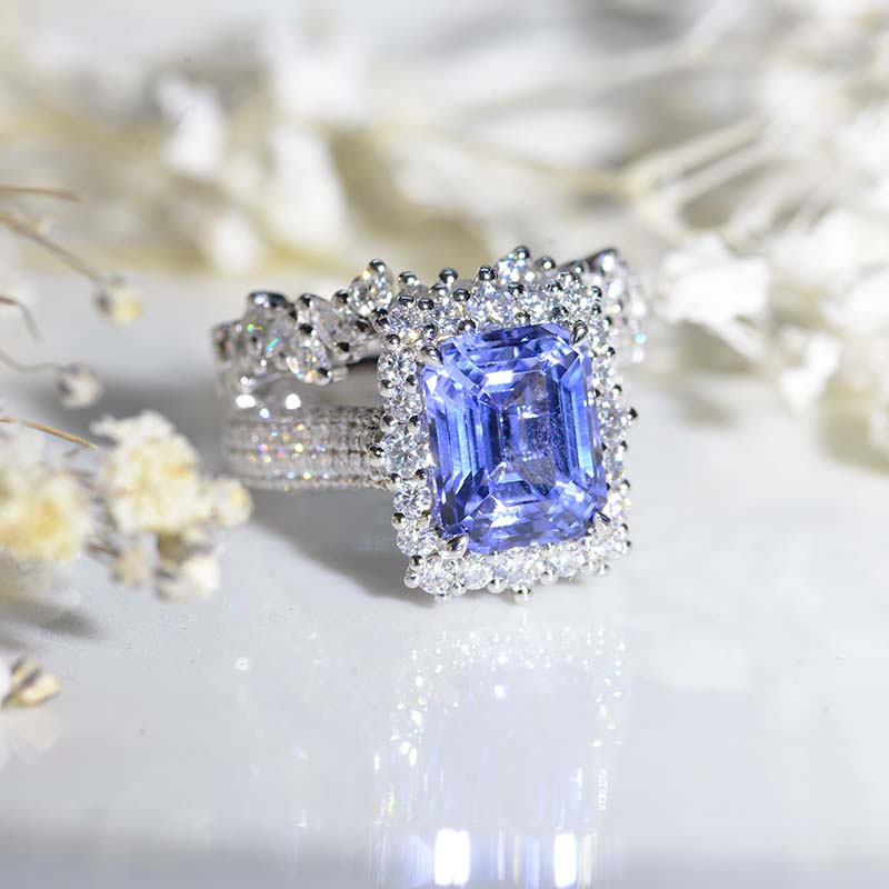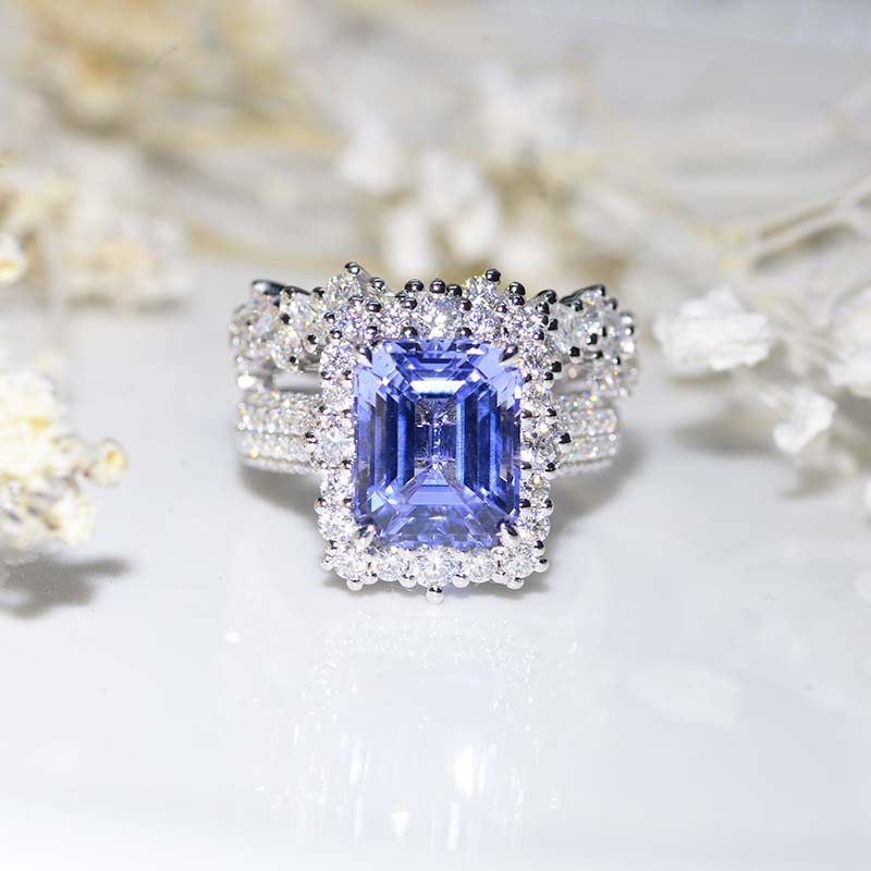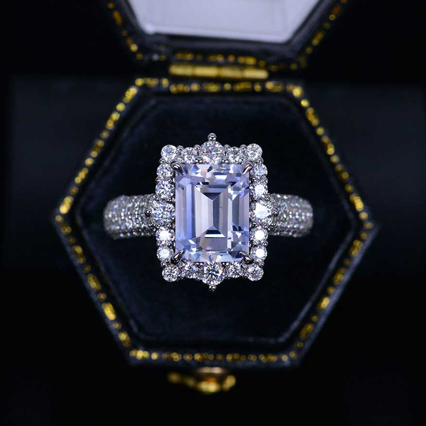 4 Carat Emerald Cut Ethically Lab-Grown Lavender Purple Sapphire Center Stone Engagement ring set of two rings.