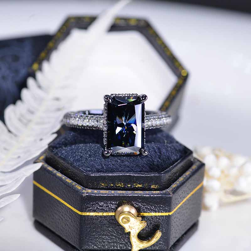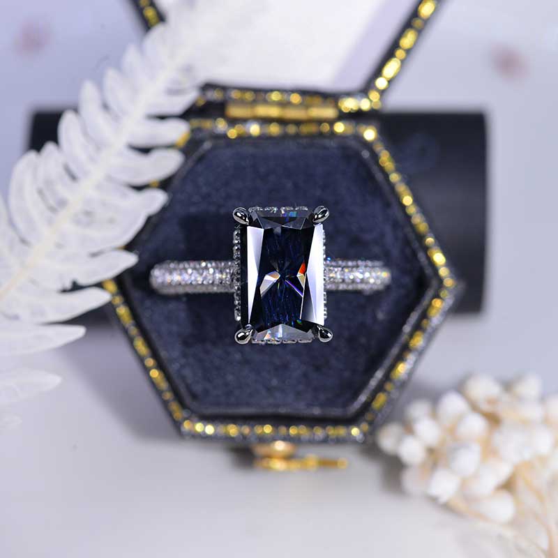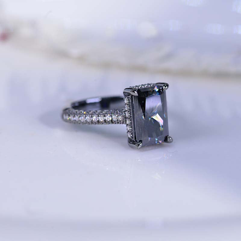 Setting:14K Gold with Black Rhodium Plating (read care instructions). Center Stone:11x7mm Radiant Cut Moissanite 4 Carat. Color: Dark Gray, Clarity: VVS1, Side Stones: Moissanite, D-Colorless Clarity: VS2-Si1, Cut: Excellent The total approximate weight of side stones: 130- 1.5 CTW Shank width: 2.1 mm Matching Band: Click here!