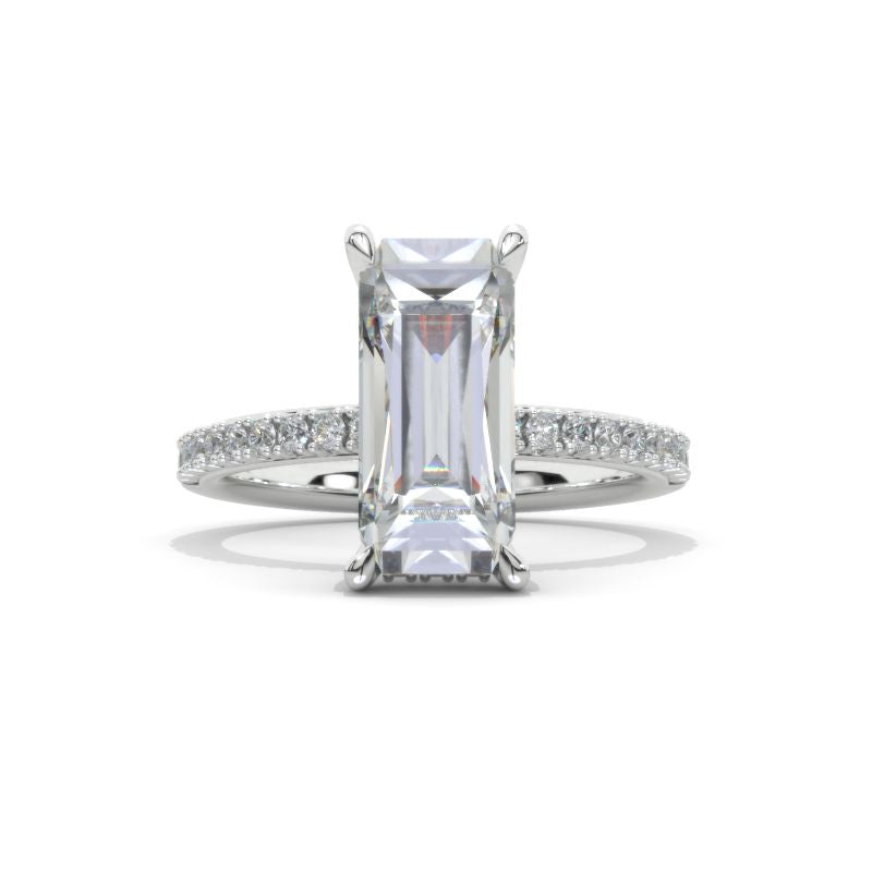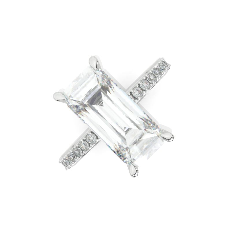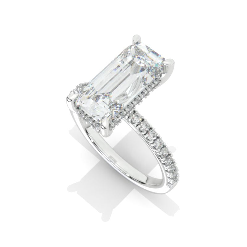 The design features approximately 5+ Carat LAB-Grown Diamond Emerald 13x6mm D-Colorless VVS1-Clarity, VG-Cut, Ex-Polish, VG-Symmetry Center Stone, 0.5 CTW D-Colorless LAB-Grown Diamond Accents Stones