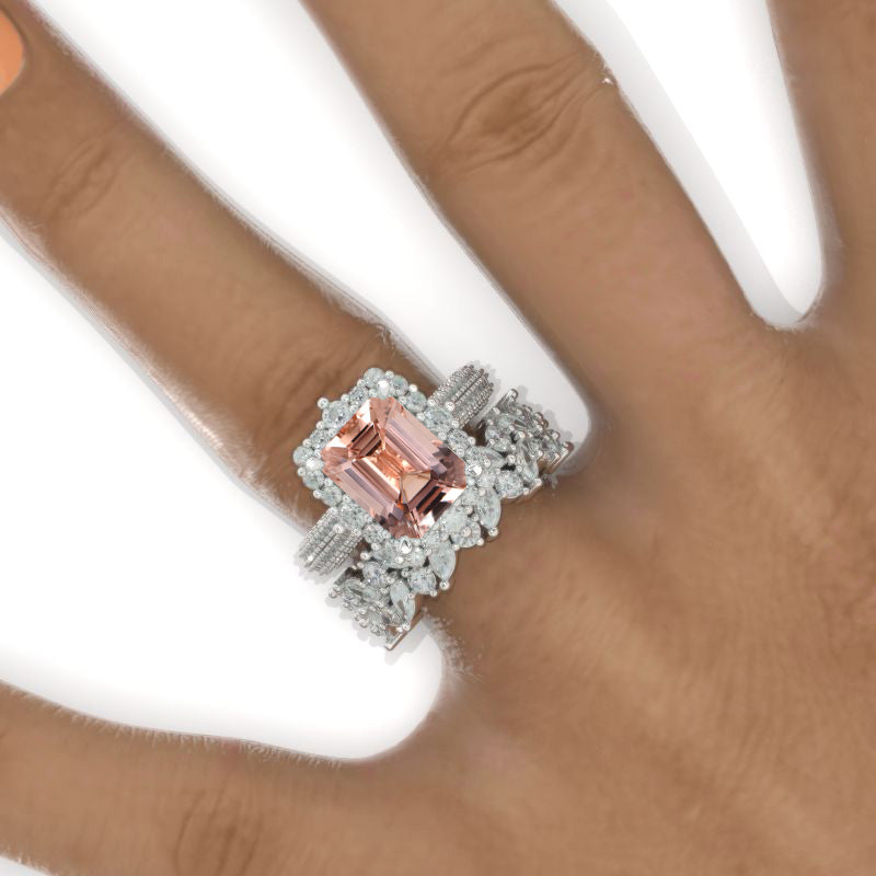 The default design option features Approximately 5 Carat 11x9mm Radiant Cut Genuine Peach Morganite Stone,VVS1-Clarity, VG-Cut, Ex-Polish, VG-Symmetry set with 1.2 CTW Moissanite Accent Stones