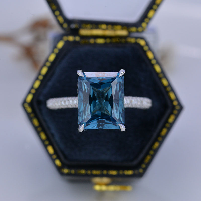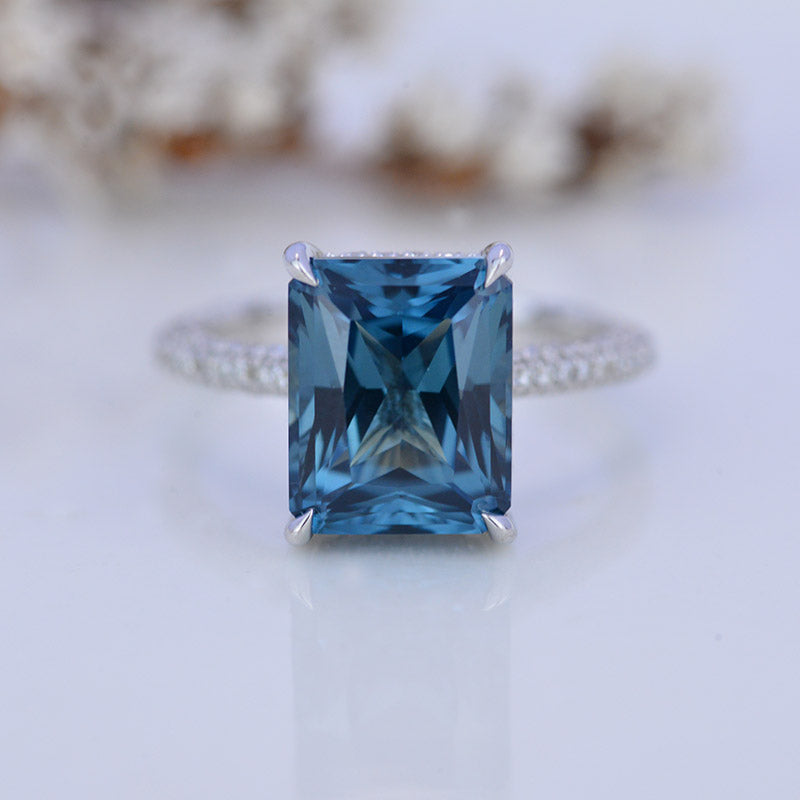 The default design option features approximately 5 Carat Giliarto Ethically Lab-Grown Teal Sapphire Emerald Shaped Step Cut 11x9mm , VVS1-Clarity, VG-Cut, Ex-Polish, VG-Symmetry Center Stone set with 0.8 CTW -134 Moissanite Accent Stones D-Colorless, VVS1 - Clarity, VG-Cut, Ex-Polish, VG-Symmetry in 14K White Gold