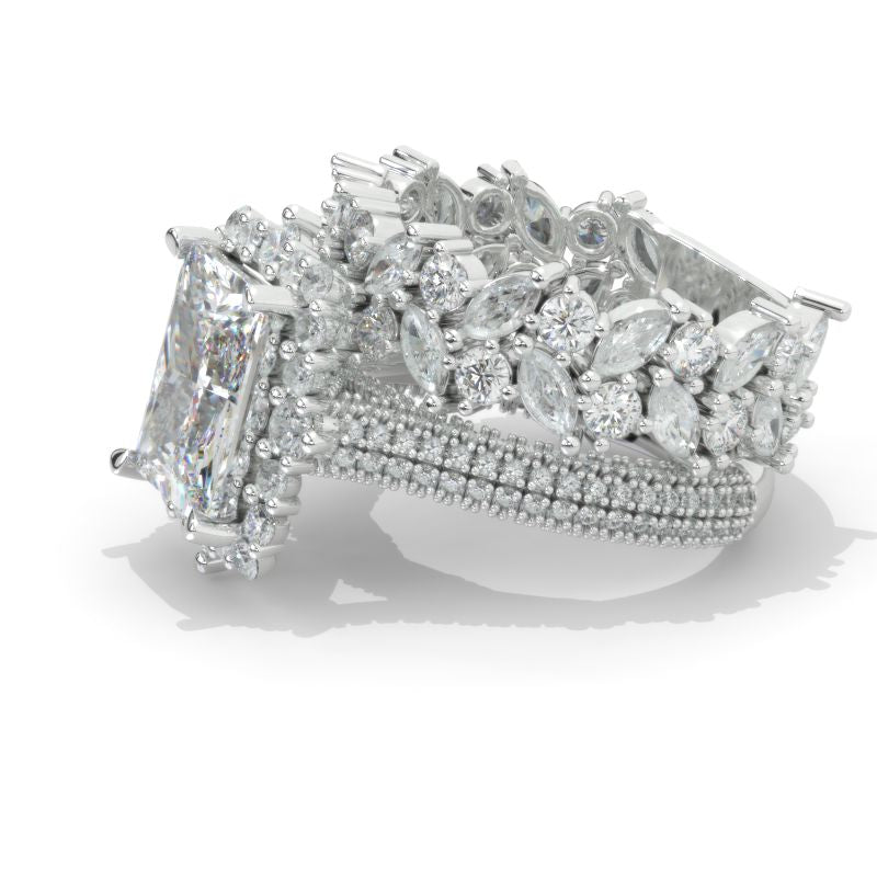 The default design option features Approximately 5+ Carat 11x9mm Radiant Cut LAB-Grown Diamond Stone,D-Colorless, VVS1-Clarity, VG-Cut, Ex-Polish, VG-Symmetry set with 1.2 CTW LAB-Grown Diamond Accent Stones