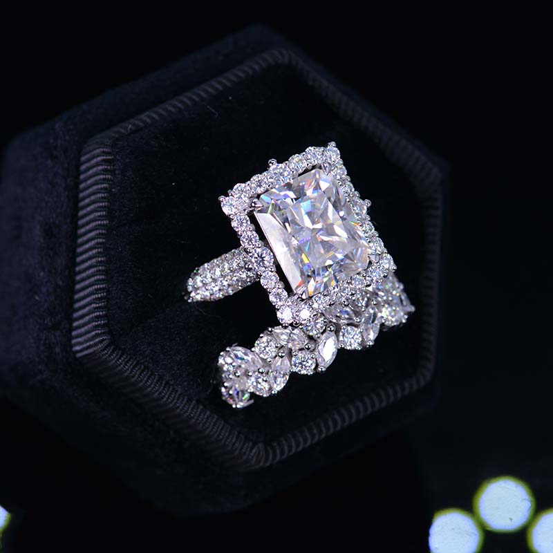 The default design option features Approximately 5 Carat 11x9mm Radiant Cut Moissanite Stone,D-Colorless, VVS1-Clarity, VG-Cut, Ex-Polish, VG-Symmetry set with 1.2 CTW Moissanite Accent Stones