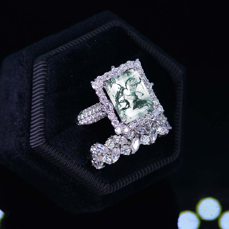 The default design option features Approximately 5 Carat 11x9mm Radiant Cut Genuine Moss Agate Stone, VVS1-Clarity, VG-Cut, Ex-Polish, VG-Symmetry set with 1.2 CTW Moissanite Accent Stones