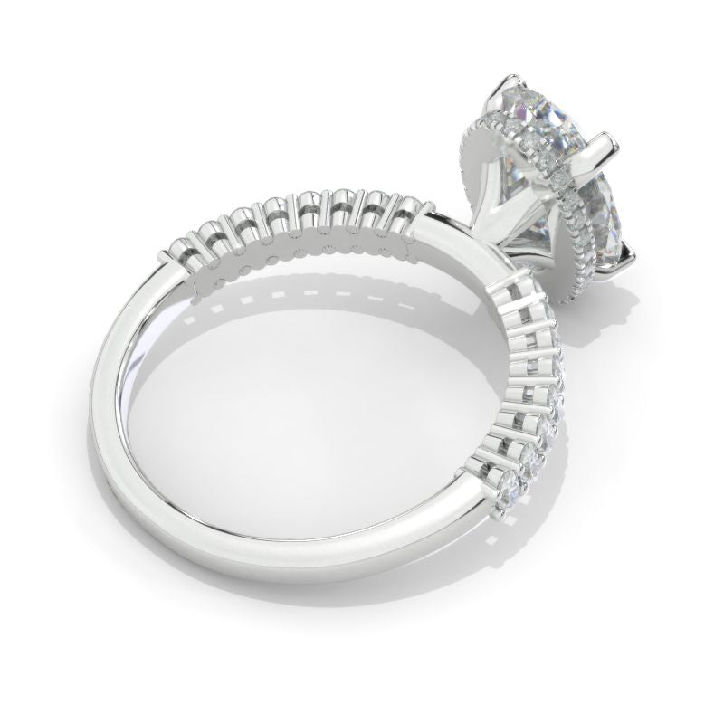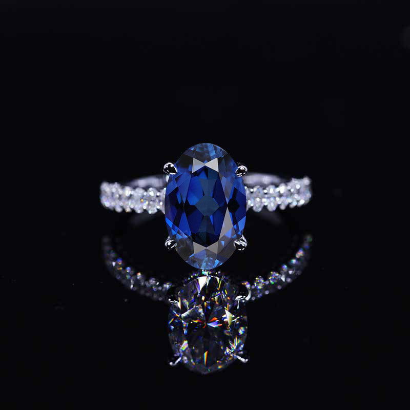 The default design option features 5 Carat Elongated Oval Cut 12x8mm GLAB-Grown Royal Blue Sapphire Center Stone VVS1-Clarity, VG-Cut, Ex-Polish, VG-Symmetry, Set With 42-Accent Stones 0.37 CTW