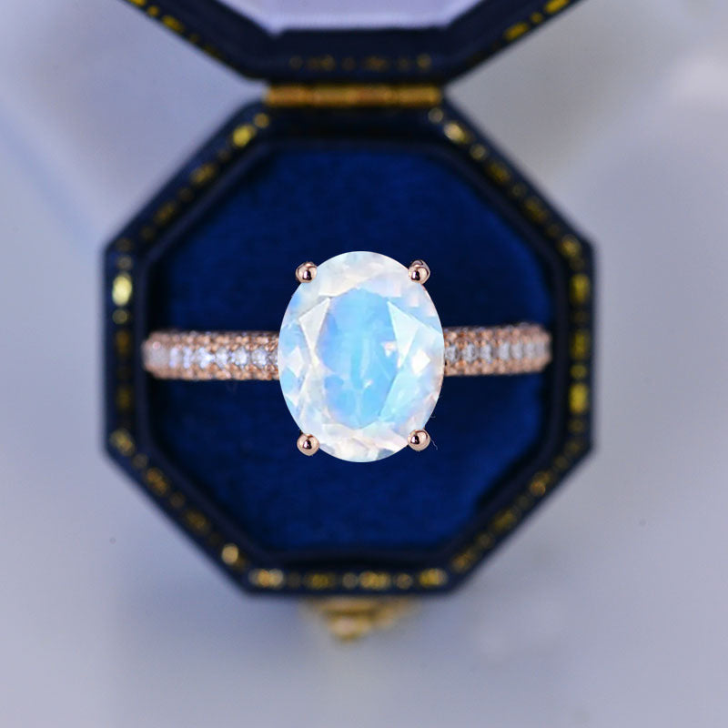 5 Carat Oval Genuine Moonstone Hidden Halo Gold Engagement Ring